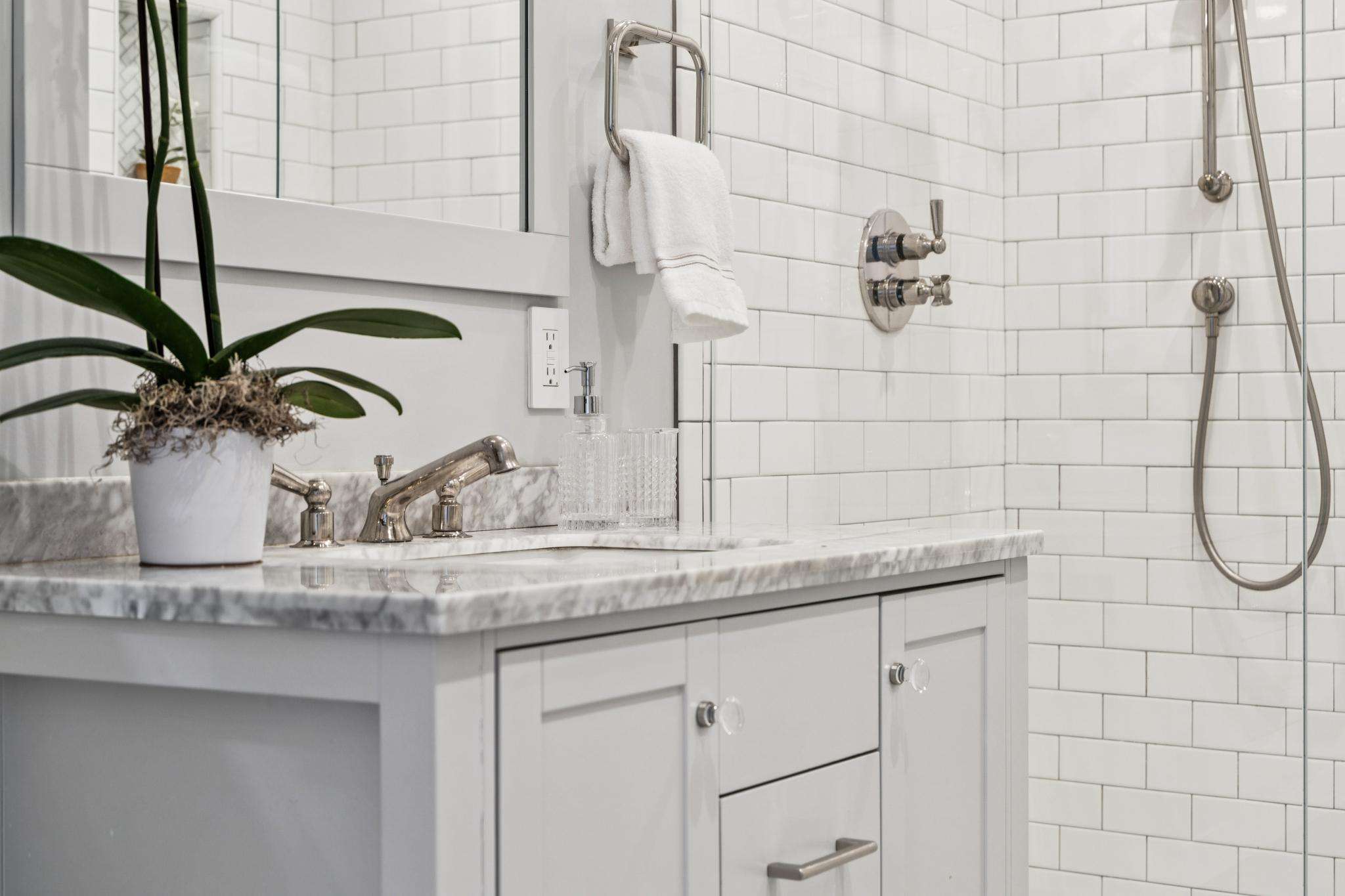 - Primary suite with views and a sliding door to the backyard. Dressing room area with a customized closet wall. Remodeled en suite bathroom has a spacious walk-in shower with both overhead and handheld showers, and a wall towel warmer. Finishes are classic Carrera marble and subway tiles, with polished nickel fixtures. Dedicated electric tankless water heater for efficiency